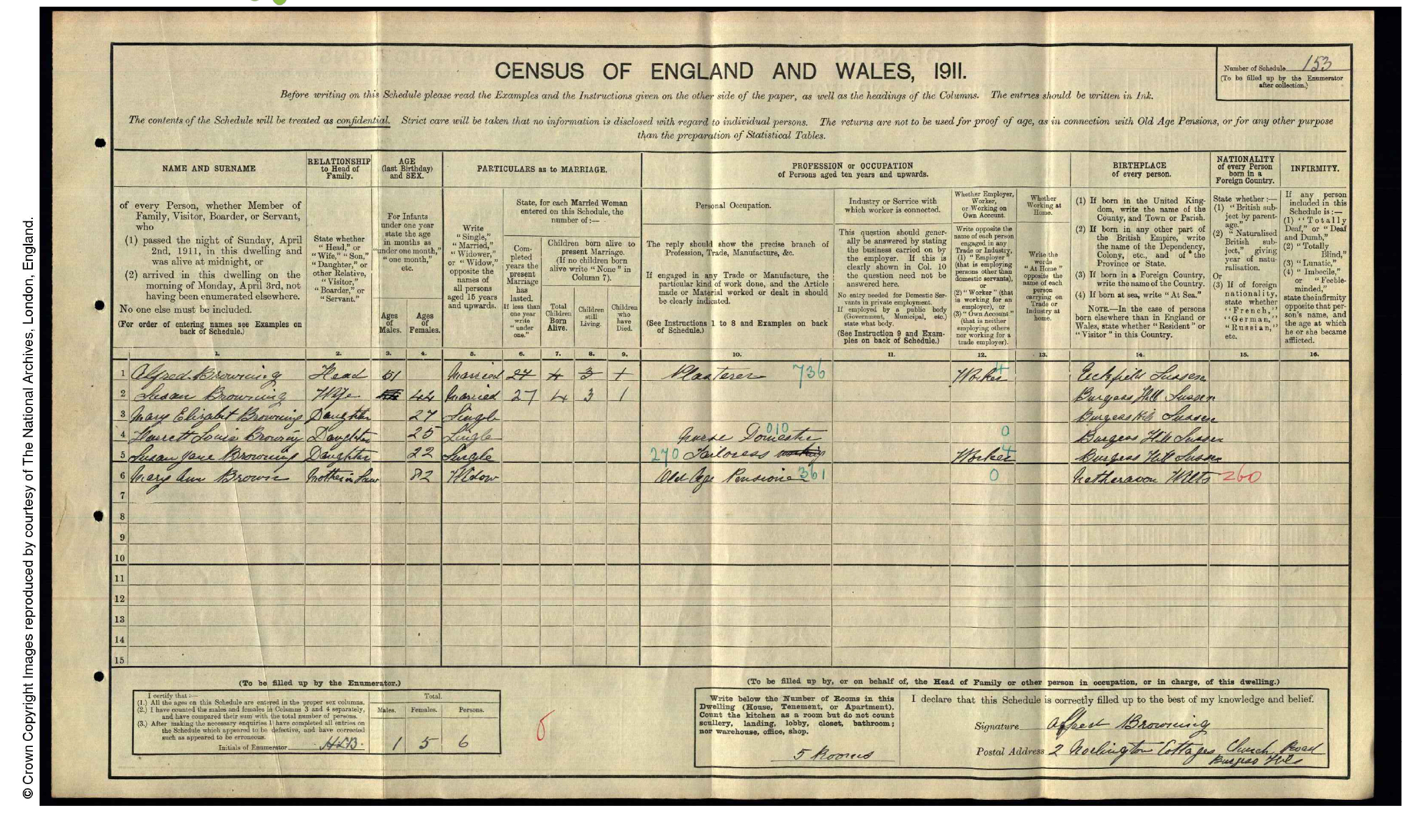 The details of the household were given in the 1911 census, where for the first time, Mary Ann was described an an "old-age pensioner".  The UK government had brought in the aged pension only two years previously, and no doubt, it was gladly received by her daughter's family. This census was quite a detailed one, giving a good description of the household which occupied the premises.