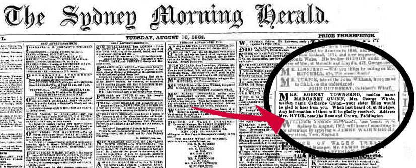 Now she was living in Sydney, Ellen took the opportunity to try to find some of her sisters, with whom she had apparently lost touch. She put an advertisement into the Personal columns of the Sydney Morning Herald, in August 1864, asking her sisters, or anyone who knew of them, to contact her: