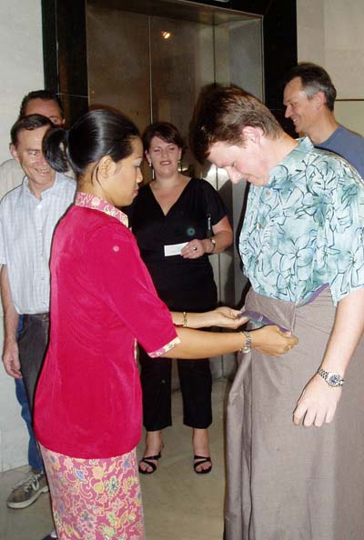 And last night, a visiting exec hosted a dozen of us at dinner at Menara KL’s revolving restaurant across the road from our hotel. Three of the blokes committed the cardinal sin of turning up in shorts, not realising what a pukkah joint the tower restaurant is. The staff there must be used to newly-arriving Australians and their dress-down ways, and have a whole cupboard of sarongs for the men to wear (right). Much laughter and hilarity as even the host had to submit to the floor-length skirt. Bed never felt so good when I finally eased myself into it some hours later. |