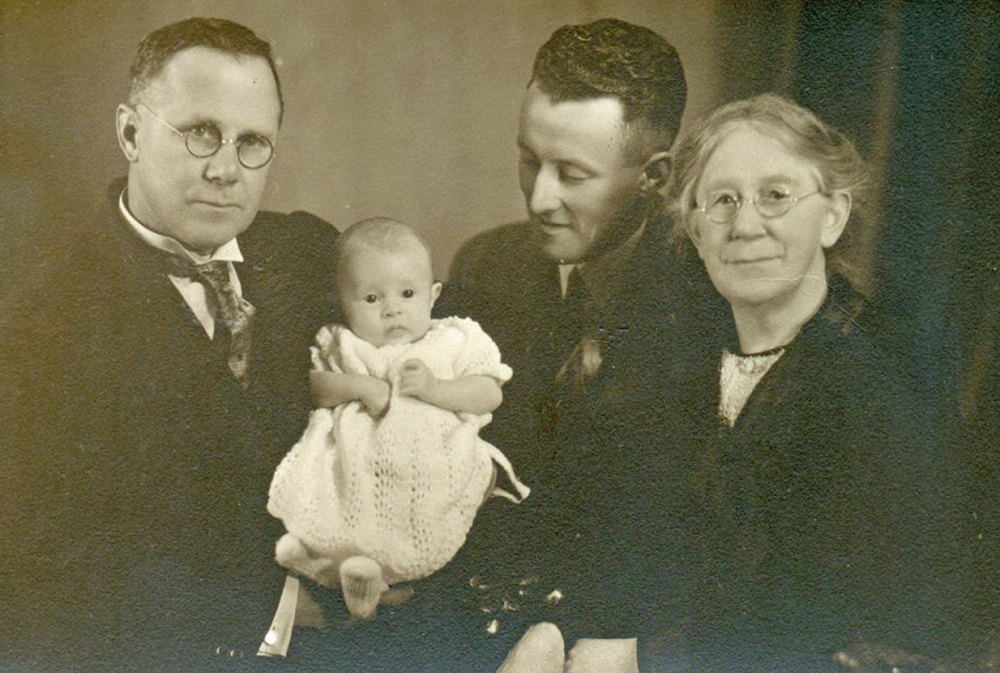 (above left) Wife Ann (nee Hammon), baby Geoffrey and Eric and (right) Four generatuons of Eric's family, with his father Alfred, grandmother Sarah, and Geoffrey